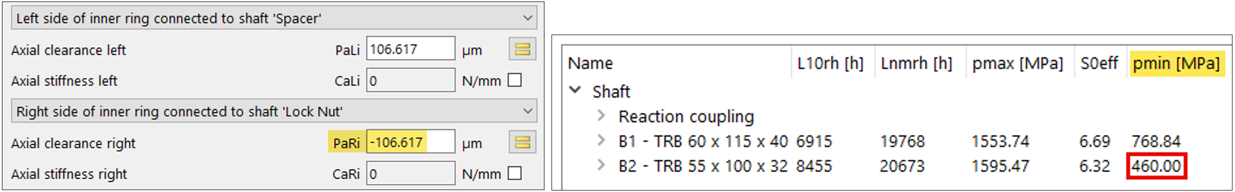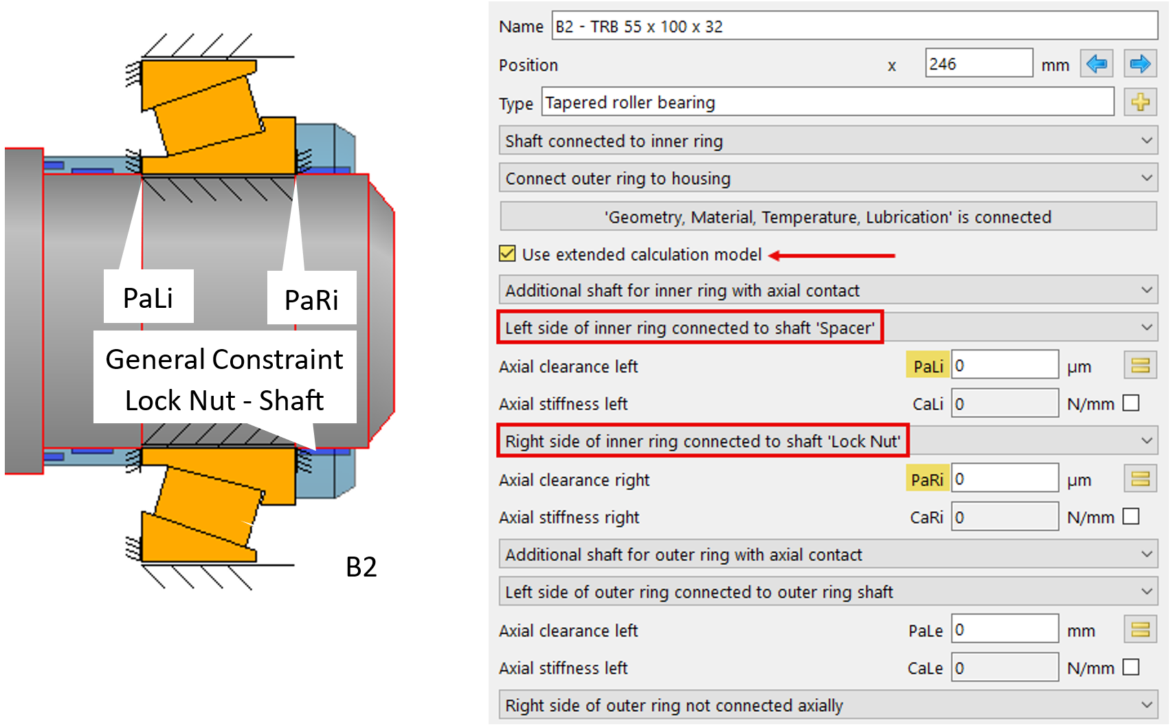 l parametro B2-Pa_Li è idoneo a rappresentare la variazione dello spostamento di precarico attraverso la sua definizione di gioco assiale tra il distanziale e l’anello interno B2 (figura 10). In 20 passi, la riduzione assiale del distanziale deve rappresentare, tramite Pa_Li, la generazione di gioco assiale tra il distanziale e l’anello interno del cuscinetto B2. La concomitante interferenza negativa tra l’anello interno e la ghiera sull’albero Pa_Ri (figura 10) deve allo stesso tempo rappresentare uno spostamento verso sinistra dell’anello interno pari ai valori parametrizzati.
