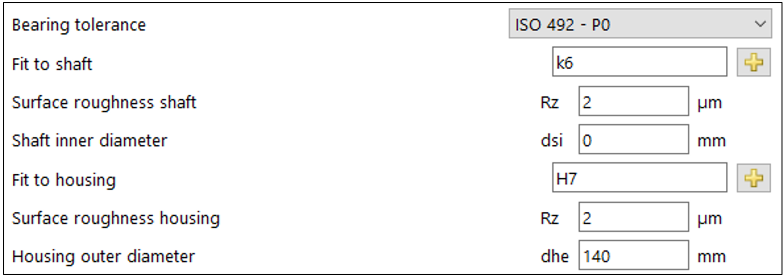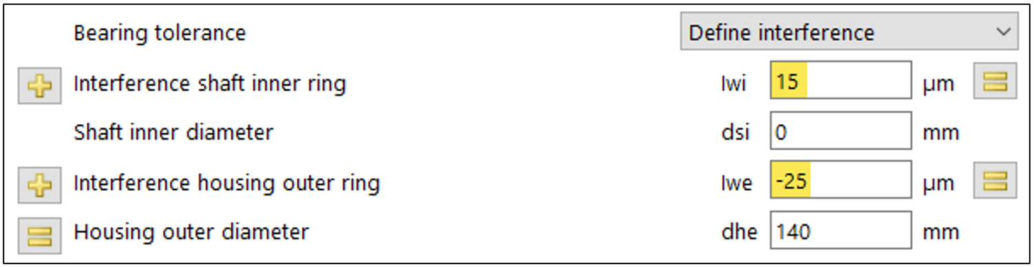 Le condizioni ambientali – lubrificazione a olio, differenze di temperatura tra albero e alloggiamento, nonché interferenze di montaggio e di accoppiamento (IR/OR) – vengono prese in considerazione.