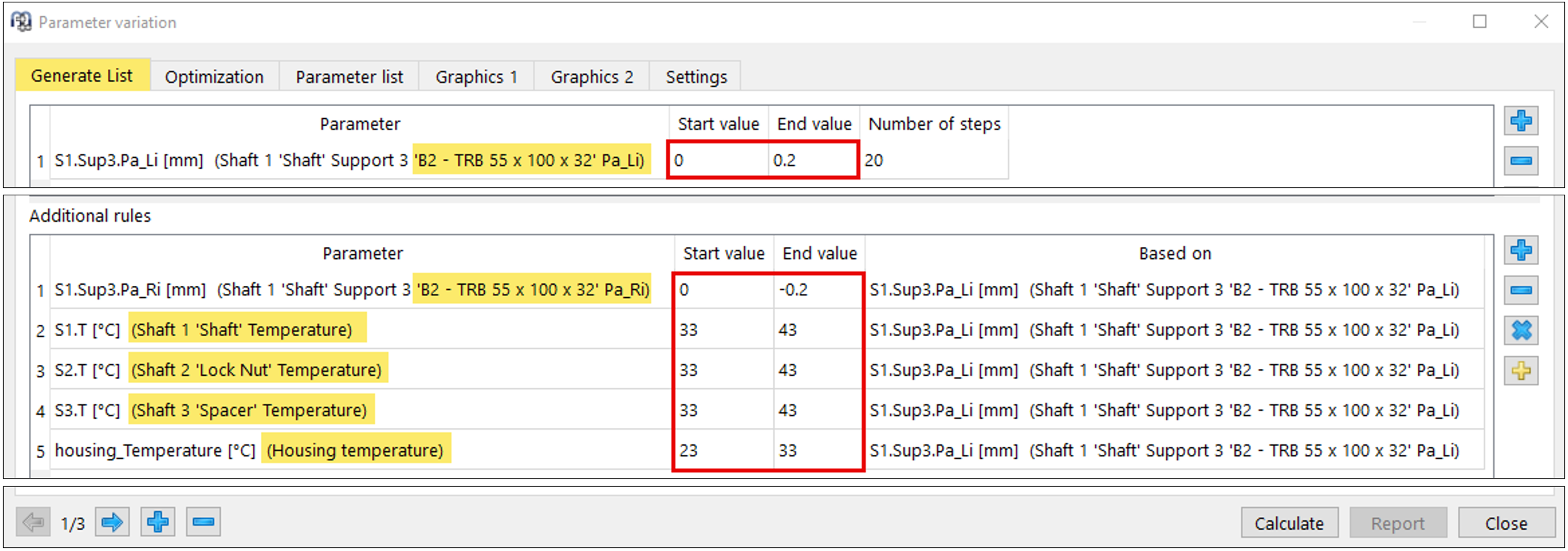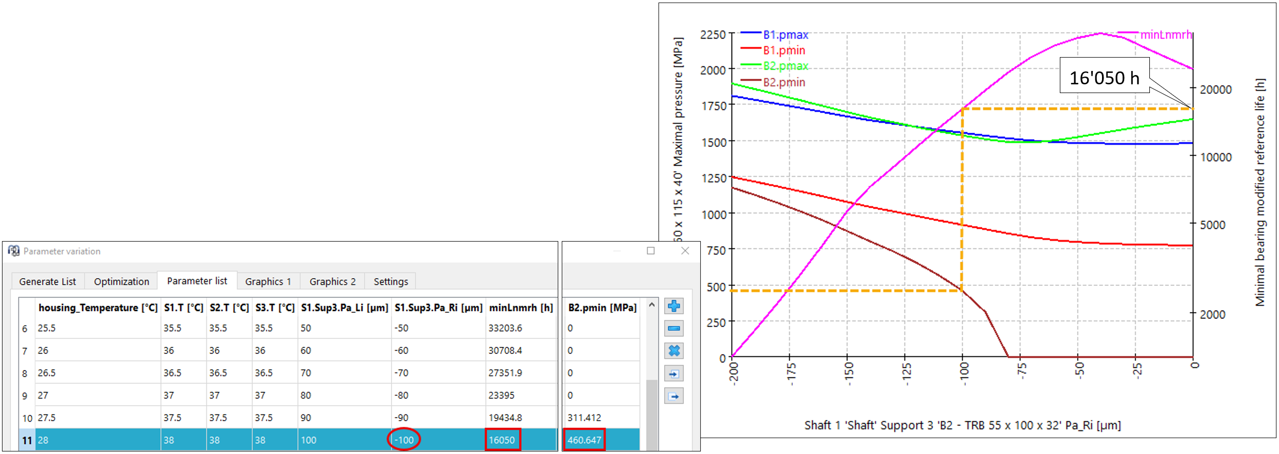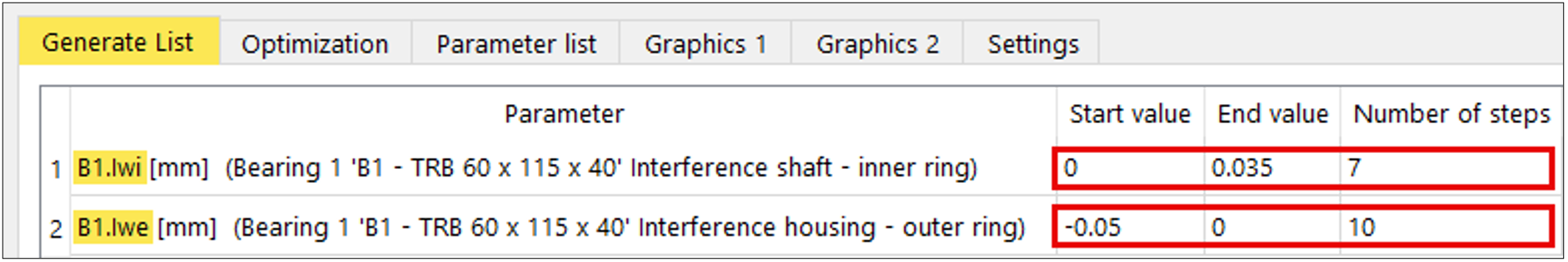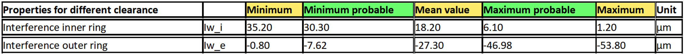 Con la vita di riferimento modificata risultante sarebbero soddisfatti i primi due requisiti della definizione degli obiettivi. La considerazione sopra riportata può costituire, per un singolo caso, il procedimento corretto qualora siano note le specifiche zone di tolleranza degli accoppiamenti e sia disponibile un’approssimazione del gradiente di temperatura. Per una produzione in serie è necessario un ulteriore supporto di calcolo, al fine di poter valutare rapidamente anche combinazioni casuali di interferenze di accoppiamento interne ed esterne. Il paragrafo seguente intende mostrare un possibile approccio mediante l’utilizzo di uno studio parametrico specifico in MESYS.