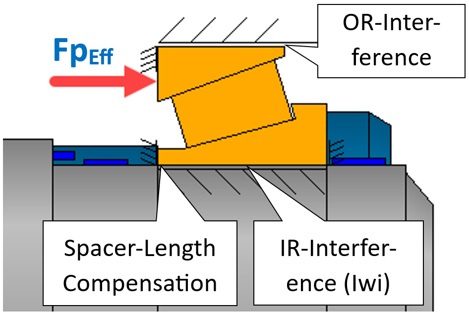 La forza di precarico effettiva del cuscinetto (FpEff) rappresenta il contributo dominante della forza totale di serraggio da applicare alla coppia di cuscinetti. Se è possibile determinare, per ogni combinazione delle interferenze di accoppiamento di entrambi i cuscinetti, una lunghezza del distanziale adeguata e compensativa, si può assumere che la forza di precarico effettiva (FpEff) rimanga costante. Un tale approccio può essere individuato mediante una funzione di ottimizzazione nell’ambito della variazione parametrica e costituisce pertanto un ausilio interessante per una produzione in serie.