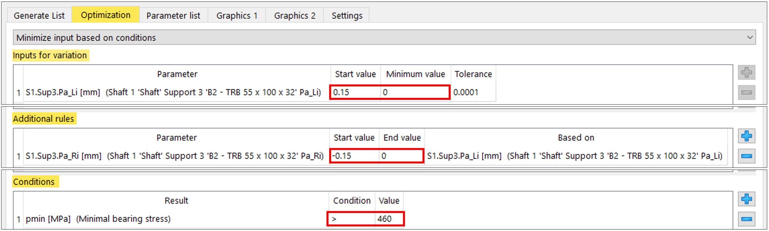 MESYS consente, nell’ambito della variazione parametrica, anche l’opzione di ottimizzazione “minimizzare un input in base a vincoli”. In questo modo è possibile minimizzare una variabile soggetta a regole e condizioni aggiuntive. La funzione è idonea a minimizzare la variazione della lunghezza del distanziale (Δ spacer), espressa tramite i parametri PaLi e PaRi (figura 18).