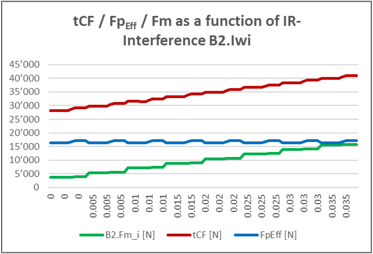 Il grafico di figura 27 mostra che, sotto l’effetto dell’adeguamento del distanziale, la forza di precarico del cuscinetto FpEff (S2.Sup.Fx) rimane quasi costante al variare della forza di montaggio interna (B2.Ffit_i).