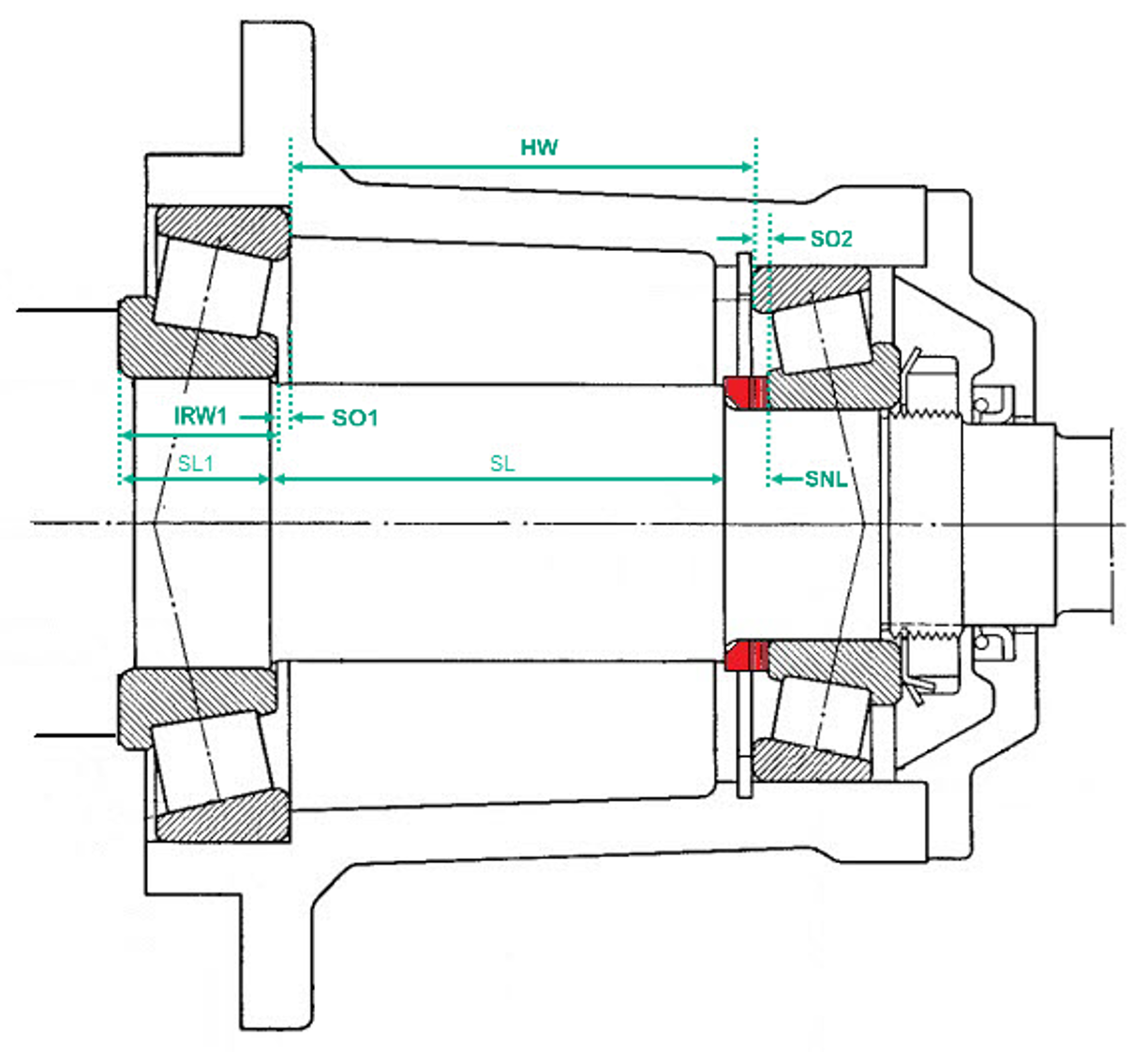 In tal modo è possibile determinare anche la lunghezza nominale del distanziale (SNL) come segue: SNL = (HW) + sporgenze (SO1 & 2) + larghezza dell’anello interno 1 (IRW1) − lunghezze dei segmenti d’albero (SL1 & SL).