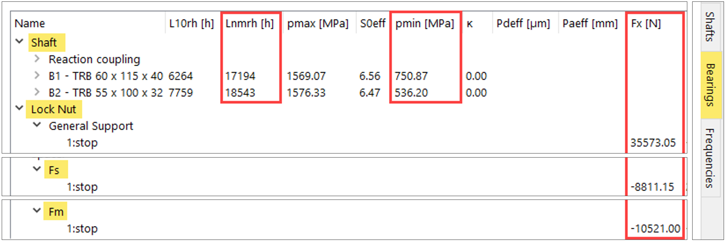 Il file importato con riferimento all’elemento 1 dello spettro di carico (montaggio) genera ora, dopo l’attivazione del passo di calcolo, oltre alle forze di montaggio interne ed esterne per B2 (Ffit), anche la forza di serraggio della coppia di cuscinetti sulla ghiera dell’albero S2.Sup1.Fx (figura 25).