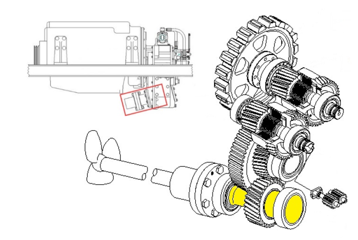 La durata di vita viene verificata mediante uno spettro di carico trasparente. A tal fine, i quattro stati di esercizio STOP, IDLE, AHEAD e ASTERN vengono considerati ciascuno con un rapporto di trasmissione fisso, ponderati con quote temporali ipotetiche e condensati in un carico equivalente sul cuscinetto. Su questa base viene verificato un intervallo di revisione di 7 anni oppure una vita di riferimento modificata di almeno 11’200 h.