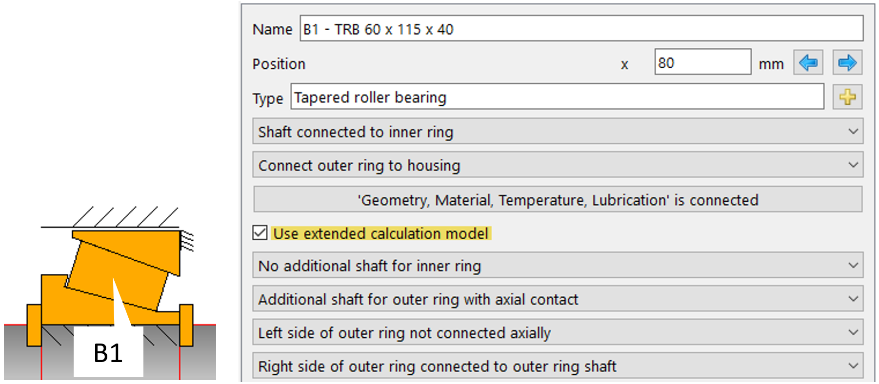 Il “modello di calcolo esteso” (figura 9) consente di definire elementi per i contatti assiali e radiali. Esso permette inoltre di considerare il gioco assiale tra l’anello del cuscinetto e l’albero oppure l’alloggiamento.