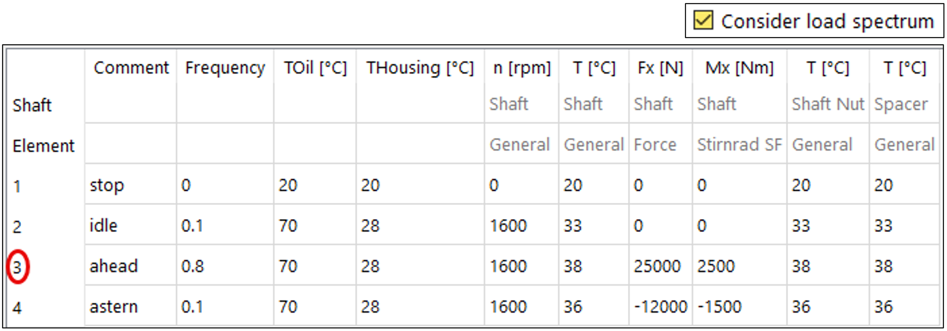 L’applicazione ipotetica analizzata rappresenta l’albero di uscita di un riduttore marino. Per la spinta in marcia avanti di 25 kN (ahead) viene assunto un momento torcente applicato di 2 500 Nm, mentre per la spinta in retromarcia (astern) viene considerato un momento di 1 500 Nm – in entrambi i casi a una velocità di rotazione costante di 1 600 rpm.