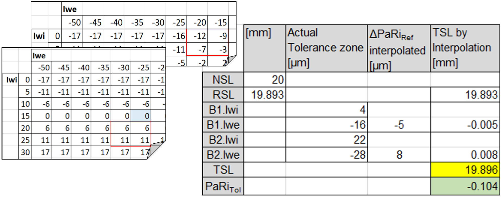 A partire dalla tabella 3 può essere costruita una matrice maggiormente orientata alla produzione, che riporti esclusivamente la deviazione rispetto a PaRiRef. Se quest’ultima viene indicata come delta_PaRiRef e PaRi rappresenta la posizione di tolleranza PaRiTol, il valore di riferimento PaRiRef nella matrice viene compensato di −107 (tabella 4). Nel caso in cui PaRiTol ≙ PaRiRef per il campo di tolleranza considerato, risulta delta_PaRiRef = 0: