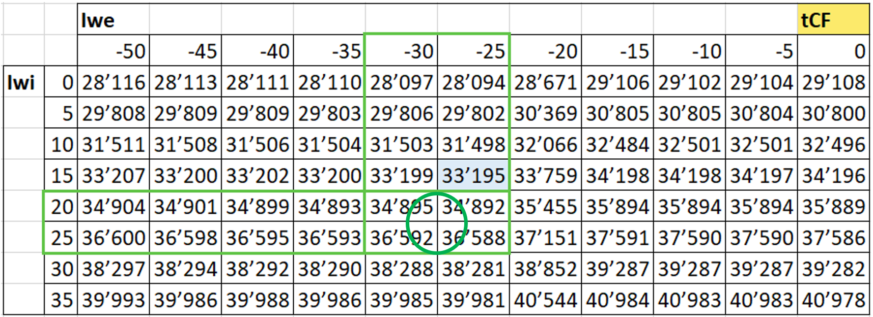 La tabella convertita in una rappresentazione matriciale e generata al punto 4.6.4 costituisce la base per la determinazione della forza di serraggio della ghiera sull’albero tCF (tabella 7).